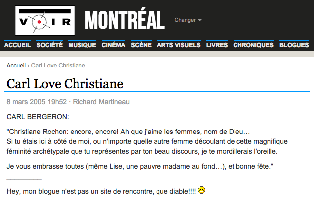 Il était au Voir, journal aussi cool à cette époque lointaine. Pis moi, comme je trouvais les chroniques de Richard assez cool, je lui écrivais. Paraît qu’il faut faire ça, aujourd’hui, pour augmenter notre Klout pis toute pis toute. Mais dans le temps, je le faisais juste parce que c’était la seule façon d’entrer en contact avec ma inner writer vu que Christopher Jones avait volé ma job. Mais ça, c’t’une autre histoire. Reste qu’une correspondance assez régulière s’était installée entre Cool Richard et moi. Et il y a 9 ou 10 ans, je trouvais ça ben ben too much. C’est fou comme ça change, hein?