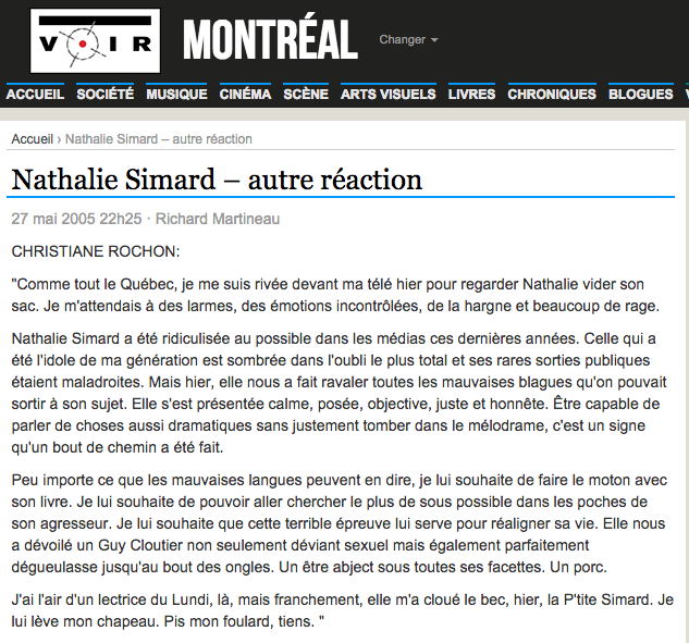 Nathalie Simard avait perdu pas mal de son lustre au cours des dernières années. Carrière boiteuse, taille de guêpe devenue taille de bourdon, des unes du Lundi pas très flatteuses. On l’appelait affectueusement le gigot chantant. Puis son histoire est sortie au grand jour. Je peux vous dire que moi aussi j’aurais mangé mes émotions, avoir été violée avec une télécommande. Reste qu’elle a accepté de raconter son histoire sordide à la télé. Je l’attendais avec une brique pis un fanal, mais j’ai été très agréablement surprise. Voici donc mon ode à Nathalie :