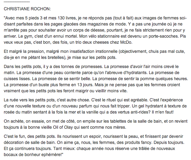 La chronique portait sur la confiance aveugle des femmes envers leurs produits. Mais Cool Richard n’avait rien compris. On n’est pas folles : on le sait que le p’tit pot Givenchy payé trop cher ne fera pas de miracles. Mais on aime le petit pot pour ce qu’il est : un p’tit pot. Petit pot de beurre… quand te dépetitpotdebeurreriseras-tu?