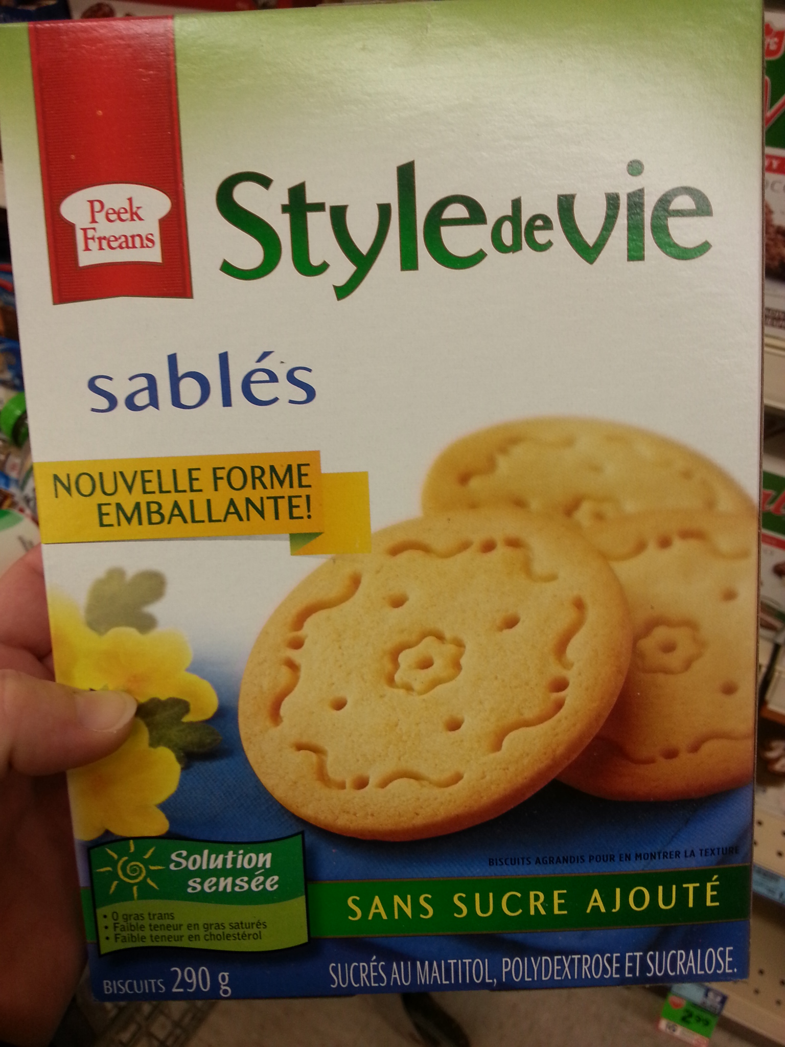 Il n’y a pas vraiment de faute ici. On parlera plutôt d’une faute de bon goût. Y’a pas plus plate qu’un biscuit Peek Freans. Personne ne se lève un matin avec un gros craving de Peek Freans, contrairement, mettons, à des Oreo ou des Whippets. Personne. Que la caractéristique mise de l’avant soit la NOUVELLE FORME EMBALLANTE-AVEC-UN-POINT-D’EXCLAMATION, ça en dit long sur le produit. Wouhou! Un biscuit rond! Du jamais vu! Faut cesser de prendre le consommateur pour un plouc. Un biscuit rond, ça va de soi et c’est jamais plus emballant qu’un biscuit carré, octogonal ou trapézoïde. Surtout pas un biscuit Peek Freans sans sucre. Quand t’as rien à dire, suis le sage conseil de Patrick Huard.