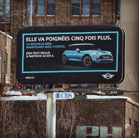 On m’a expliqué que c’était pour annoncer le modèle cinq portières (et non portes comme le clament haut et fort tous les constructeurs automobiles, mais faut apparemment choisir ses batailles). Le hic, c’est qu’on ne comprend pas le message, restant accroché à l’injure visuelle qu’est cette phrase. Je mets ma main au feu que ce panneau causera des accidents. Et j’espère que le monsieur fru ayant déposé une plainte à l’OLFQ pour les pubs en anglais de Sugar Sammy prendra le temps (dont il semble avoir des réserves inépuisables) de passer un savon public à Mini, à ses agences et à ses conseillers marketing.
