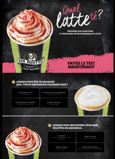 Van Houtte fait dans le nul à deux niveaux. Le premier, où ils nous proposent de découvrir quel genre de café au lait on peut bien être. Mais on s’en contrefout suprêmement!!! C’est ça ton accroche? Demander aux gens quelle sorte de café ils sont? Après des brainstorms pis des briefs pis des allers-retours chez le client, c’est ÇA qui a été retenu?